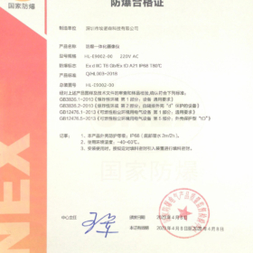 Our cameras are certificated to suitable for ⅡA、ⅡB、ⅡC inflammable and explosive environment with combustible gas & Air mixed dust environment use . Ex-proof marking: Exdb llB T6 Gb/Ex tb llC T80℃ Db .